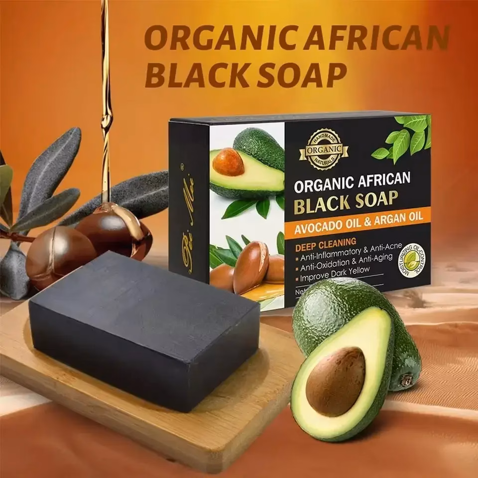 Glamorös Ansikts/kropps organisk Black Soap berikad med avokado och arganolja erbjuder en lyxig rengöringsupplevelse med extra hudvårds fördelar. Kombinationen av ekologiska ingredienser ger en djup och skonsam rengöring, som avlägsnar orenheter och överflödig olja samtidigt som den ger näring och återfuktar huden. Avokado olja är rik på vitaminer och antioxidanter, vilket hjälper till att återfukta och mjukgöra huden, medan argan olja ger ytterligare återfuktning och främjar en hälsosam hy. Denna tvål är idealisk för alla hudtyper, inklusive känslig och torr hud, och lämnar ditt ansikte uppfriskat, föryngrad och strålande med en touch av alla naturliga medel som kroppen behöver. Afrikansk black soap